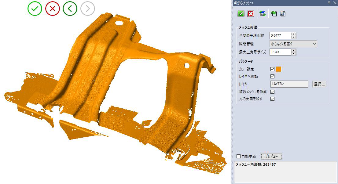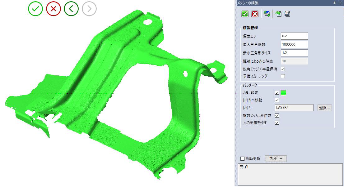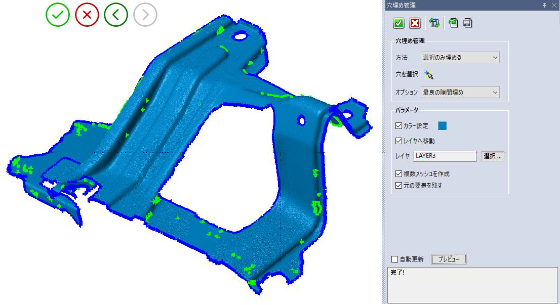 リバースエンジニアリング機能 機能概要 ・点からメッシュへ 選択した点群から開始することでメッシュを作成することができます。 点群を選択すると、システムはメッシュの生成のための最適なパラメータを自動的に計算して提案しますが、希望する結果を得るために設定を変えることも可能です。 メッシュで作成された三角形の数も表示されます。 ・メッシュの穴埋め 選択されたメッシュ上に検出された隙間(穴)を埋めることができます。 充填するギャップを選択し、連続したメッシュを作成するためにさまざまな方法を使用して補完が可能です。 ・メッシュの精製 メッシュの曲率領域をより良く描画するために、偏差エラーや新しい頂点を追加することによる三角形の最大数などのパラメータを設定することで、メッシュを編集して滑らかにすることができます。 より良い品質の精製を得るために、元の点群を参照として選択することも可能です。 ・メッシュのスムージング パラメータを定義することにより、選択したメッシュ上の全面をスムージングすることができます。 サーフェイスのうねりが保持したい実際の形状である場合、このオプションは大きい凹凸のみを削除し、低いうねりを維持して形状の詳細を作ります。